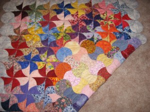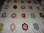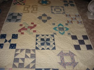 I was now ready to start another quilt!! I went to a quilt show and they had baggies that had directions for a block and the fabric in them. I bought about 25 of these baggies of blocks. Home I went and hand sewed the blocks together. Then I hand quilted it. It took me 12 months to complete the quilt. (I still didn’t know what a binding was! LOL!!)