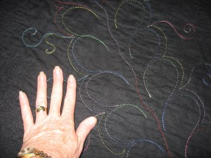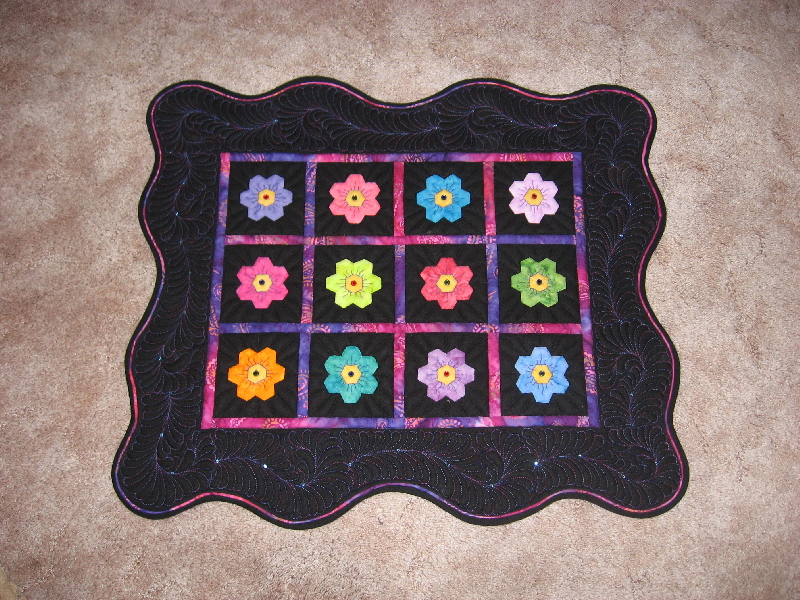 I put feathers in the colored blocks and stippled in the black areas. I think someday I’ll take those feathers out and quilt something different in there! See, I can do small feathers now! This is the last thing I’ve made.
