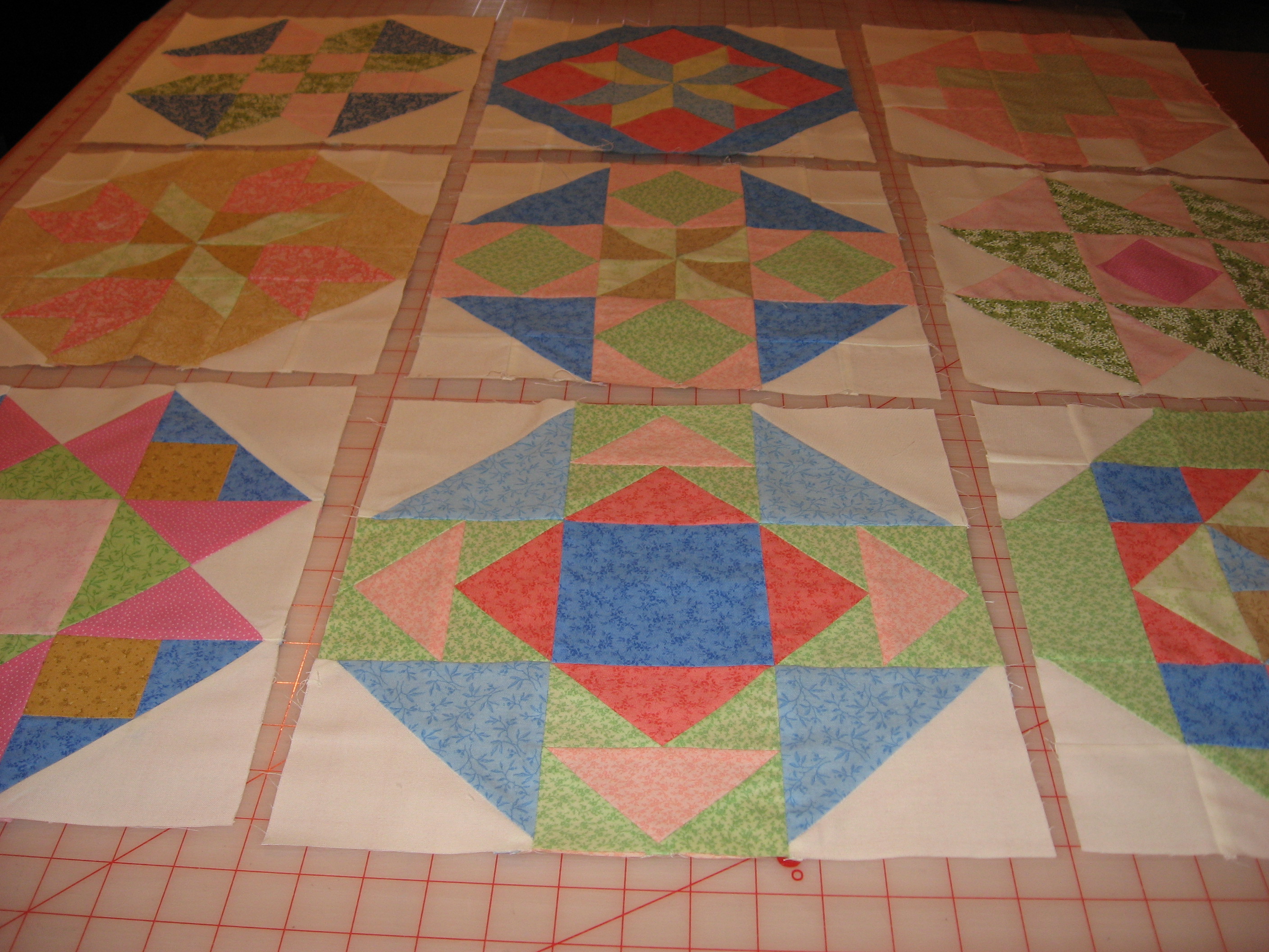 Thanks to those who responded to my question about which quilt they liked better. I do like them both but I decided to go with #2. I’ve been busy dyeing fabrics for it. I’ve dyed 11 different colors. I’ll only need 8 of these, but I figured that I could choose which colors I wanted after they were all dyed. I dyed 4 shades of each color and they all came out different. Some look more marbled, some came out dark to light and a few came out just barley a lighter shade different than the other pieces. Oh well, I had fun dyeing all the fabrics. I used cotton sateen this time. Here’s how they look.