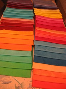 Thanks to those who responded to my question about which quilt they liked better. I do like them both but I decided to go with #2. I’ve been busy dyeing fabrics for it. I’ve dyed 11 different colors. I’ll only need 8 of these, but I figured that I could choose which colors I wanted after they were all dyed. I dyed 4 shades of each color and they all came out different. Some look more marbled, some came out dark to light and a few came out just barley a lighter shade different than the other pieces. Oh well, I had fun dyeing all the fabrics. I used cotton sateen  this time.  Here’s how they look.