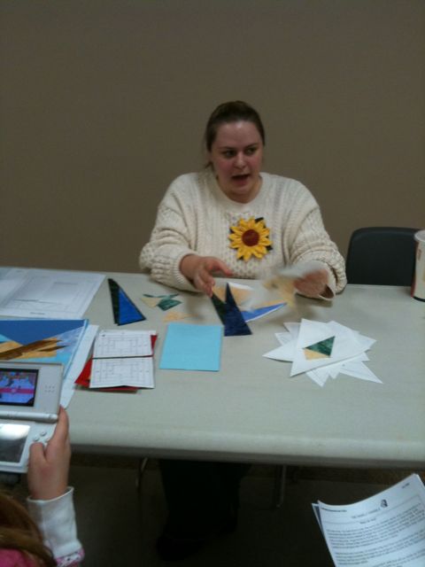 And Paper piecing a log cabin. Of course, that picture doesn’t want to show up here. hmmm.  Oh well, Doris was showing us how she did her blocks and she is making a gorgeous red and white pineapple log cabin. She had the quilt hanging beside the table and it’s beautiful!!