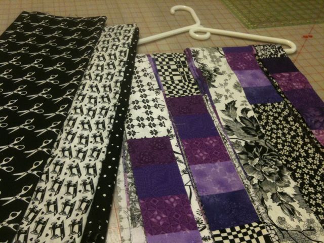 I’ve made some progress on the Jiffy Jive quilt. I have the purples added to the strips, now it’s time to sew the strips together. The pattern doesn’t call for borders, but I think I’ll add some to my quilt. I have some black and white fabric that has featherweight machines on it and then I picked up a black and white fabric last week that has scissors, I thought that would be great for borders on this. I think it will need a very small inside border as well, I don’t know if I’ll go with the polka dots or use a solid black for that. I have time to think about that part………