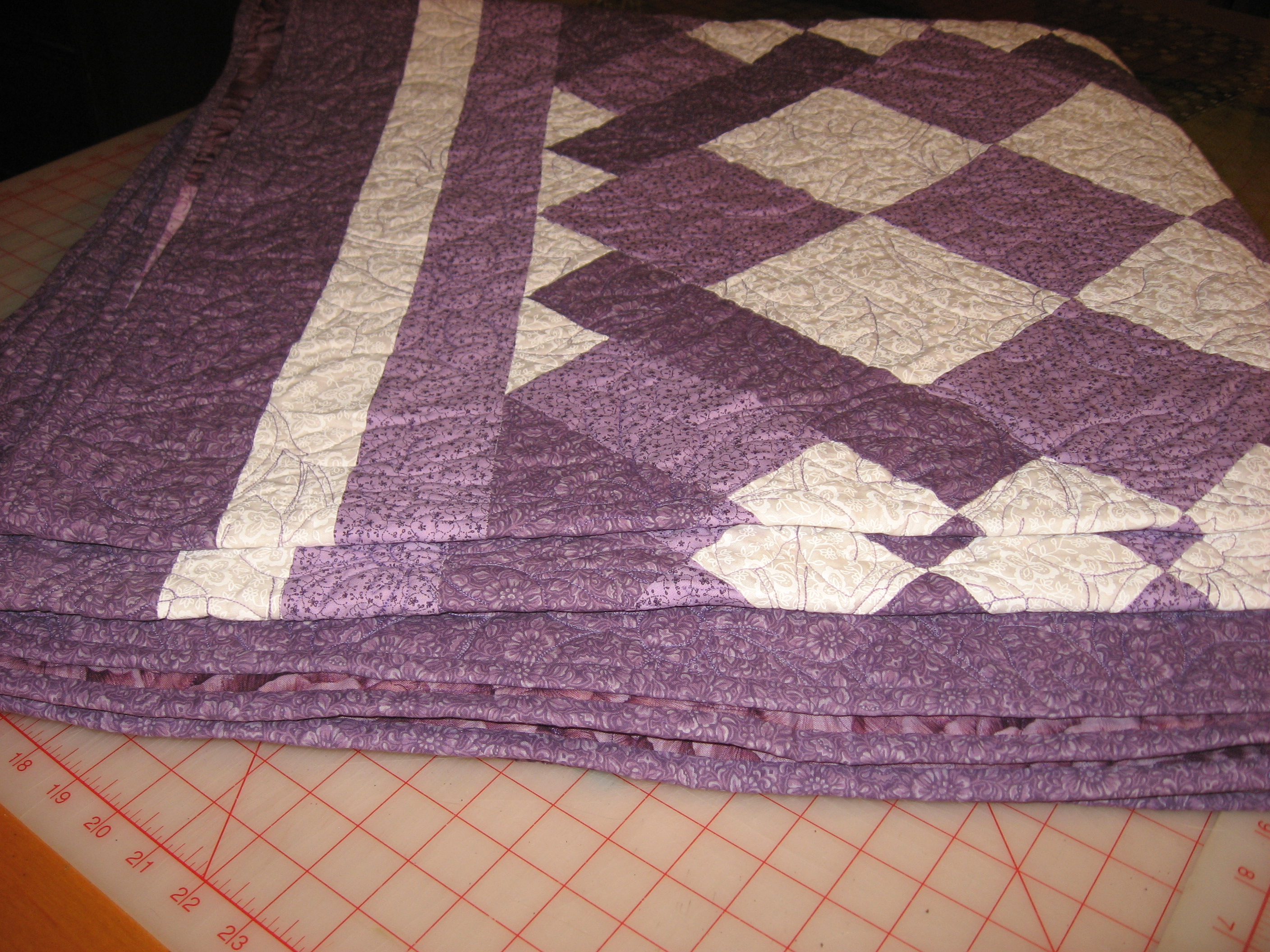 I finished another UFO on my list!! That makes 13 for this year. YEAH!! I quilted it last month but hadn’t had time to sew the binding down. That’s what road trips are for! LOL!! I finished binding on 2 last month while I was on the bus trip and then this one over the weekend in the car. It was a big one too. 104″x104″ I’m glad it’s finished.