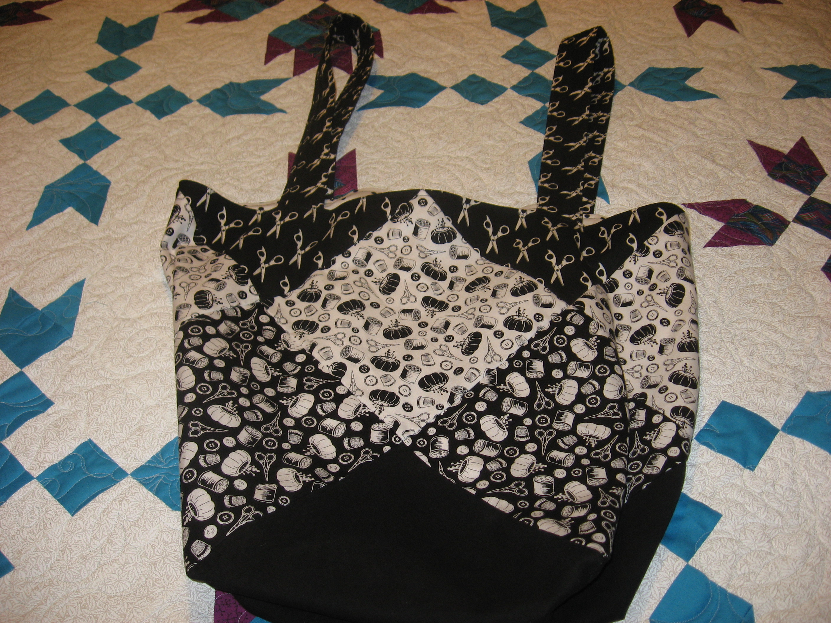 I picked up some black and white fabric that had sewing notions on it from one of the shops and then later I bought a pattern for a quick bag. After I got home I decided that I would use the fabric I bought and add a solid black and some fabric with scissors (since I needed 4 fabrics) and make the bag from it. It was a great bag to carry stuff in. I used it Saturday at the AQS show.