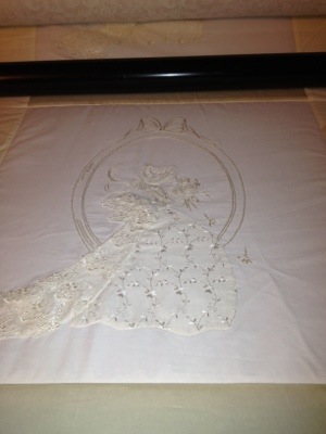 Here’s the quilt I have on Millie today. It’s a beauty. It’s all creams and white. All I’ve done so far is all the SID work around the blocks. Now I’m ready to start the fun quilting.