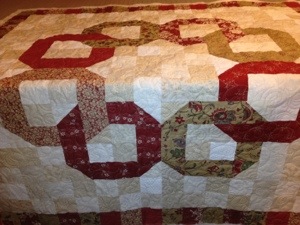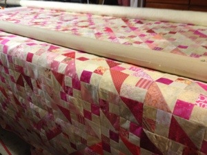 Now she’s busy quilting on another quilt. This one is a scrappy pink quilt. Pink is not my favorite color, but this is one pretty quilt, I think!