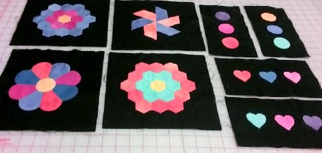 My original plan was to use 30’s fabrics like the pattern shows. I almost gave the pattern away thinking that I’m never going to make it. But then one day I wondered how it would look with a black background and hand dyed fabrics for the paper pieced pieces. Once I decided to do it that way, I was ready to get started on it. Here’s what I have so far.