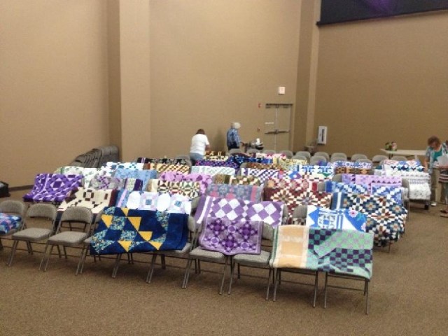 Anyway, I’m packing up my quilts into the suitcases and boy that’s a job in itself!! I keep them all laid out on the bed in the guest room until it’s time to pack, that way they don’t have fold marks on them. Last month we spoke at the Lee’s Summit, Missouri quilt guild. After the program, they laid the quilts out over the chairs, which allowed the ladies to get a better look at them up close. They had already folded a few of them before I snapped a picture, but here’s most of them. We show about 45 quilts.