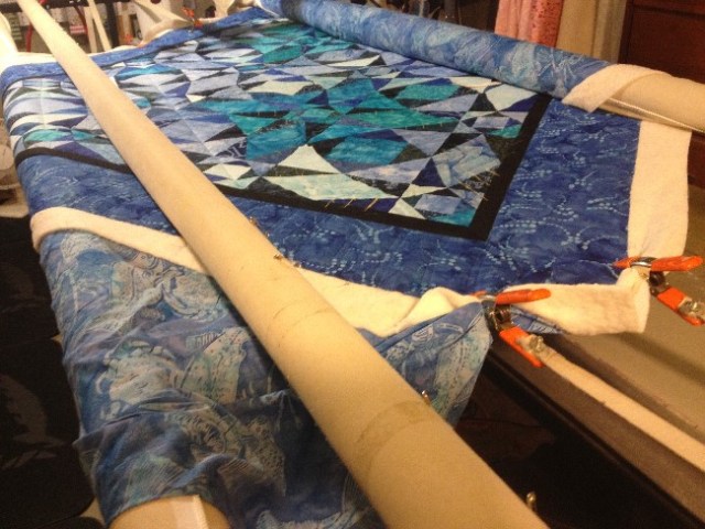 I did the borders first and basted through the center of the quilt, then took it off and turned it cockeyed in order to quilt across it diagonally.