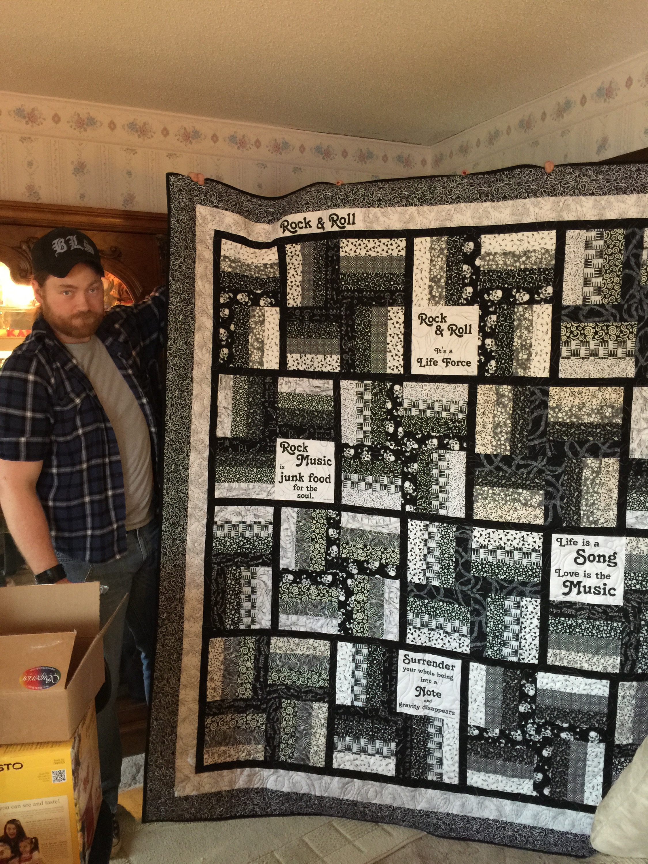 I think his girlfriend Sarah was the most surprised by getting a quilt. She liked hers too!