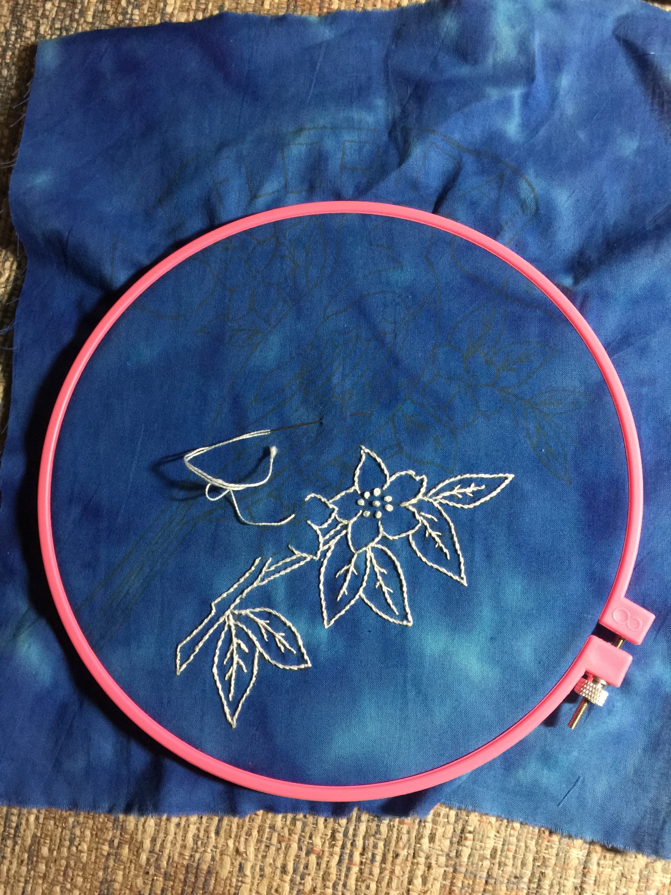I started out using 2 strands of embroidery floss, which was a pain, pulling off 2 strands each time I ran out. I was also marking it with a white chalk pen, which would wear off as I worked, so I had to keep remarking the design.