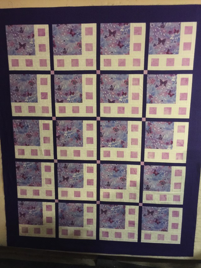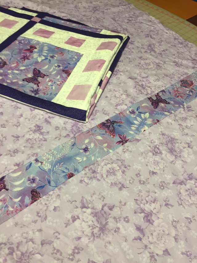 Yesterday I decided to come up with something for the back, so I found a couple pieces of leftover wide backing. I cut and peiced them and added the last remaining piece of the butterfly fabric that I used in the top.