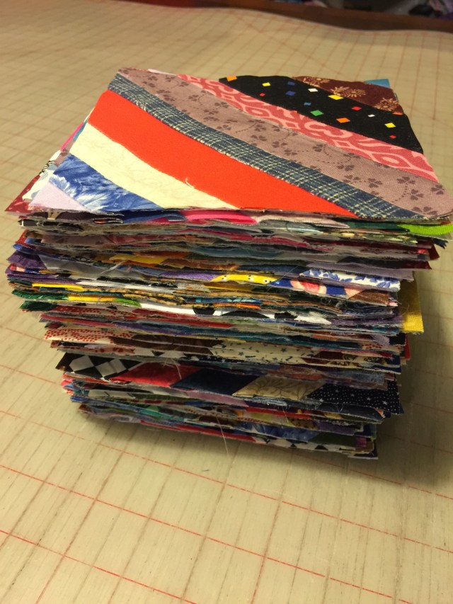 I still have the Kansas row by row on the wall from last week. I have no idea what I’m going to do at this point, so I just look at it……..eventually something will strike me and I’ll work on it. Until then, I will continue to make string blocks. I need a total of (256) 5 1/2″ squares. So far I’ve made 107.
