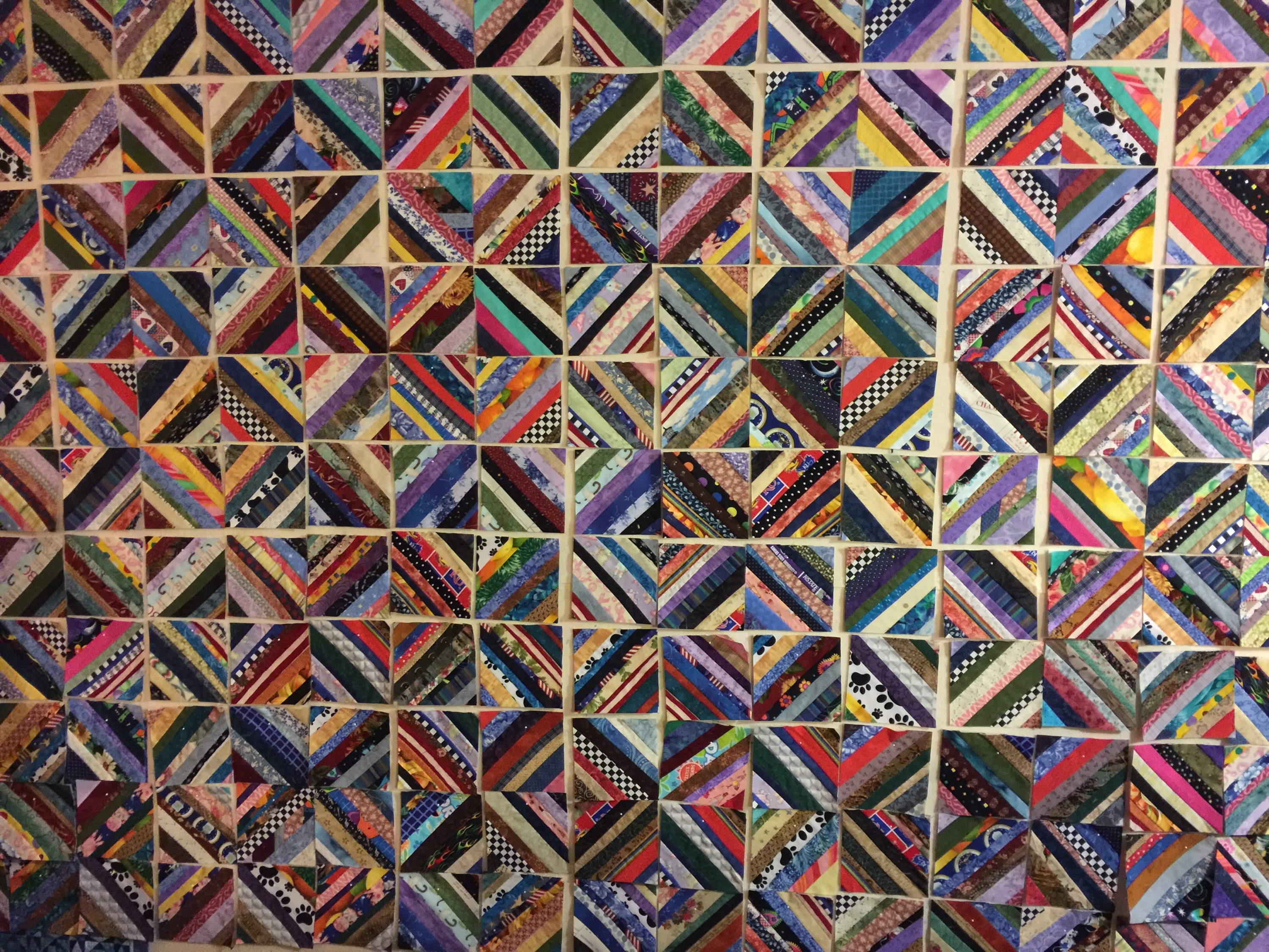I’ve become obsessed with finishing these blocks. I have 41 more to make before I can start putting them together. Last night I took the Ks row by row off the wall and started putting the string blocks up. My wall isn’t big enough to put all of them on………here’s how it looks now.