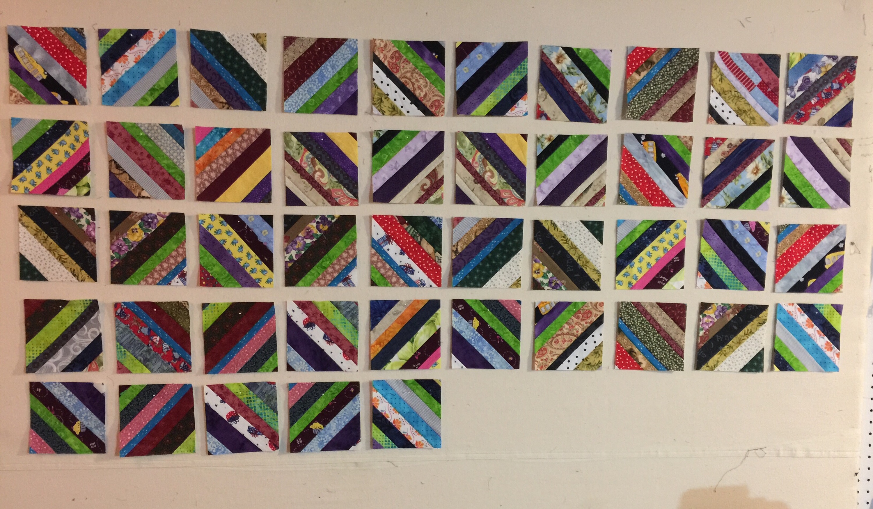 I have all the string blocks made that I need for my next string quilt up on the wall today.  I have a few of the small blocks sewn into bigger blocks but I took the picture prior to getting them made.