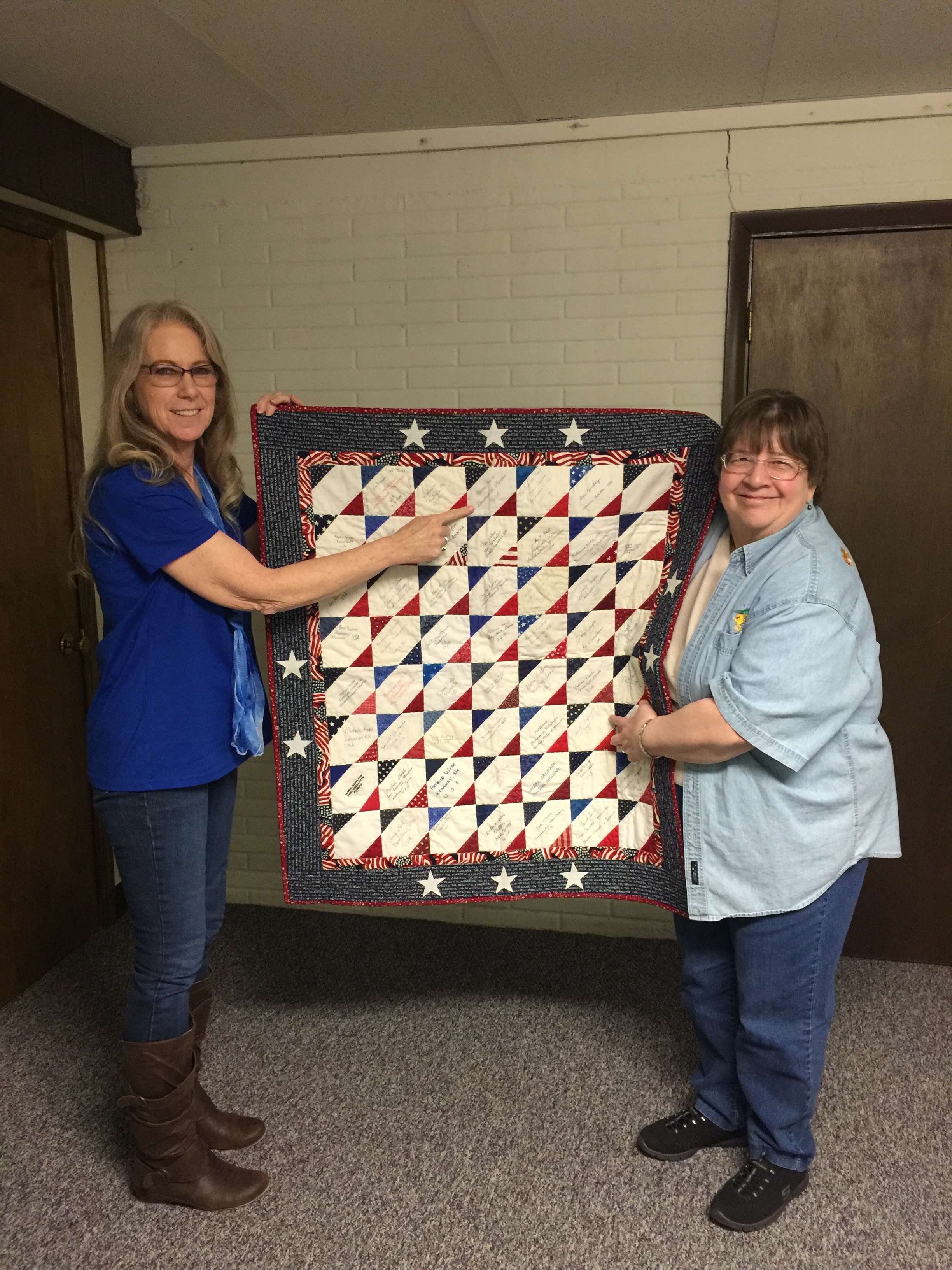 During the program, one of the quilts I show is from an online exchange that I participated in years ago. It was shortly after 9-11 and the online group I belonged to exchanged signature blocks done in red white and blue. We each signed our name and put our City, state and country on the block. When I showed it today, one of the ladies said she participated in that exchange and maybe one of those blocks was hers. After the quilt was held up and shown, Sharon looked for the ladies name and found it! Sure enough, she had made one of the blocks. She was living in Vegas at the time of the exchange so her block has her name and Las Vegas. Wow! What a surprise that was to find someone who had made one of the blocks! Here we are pointing at our blocks.