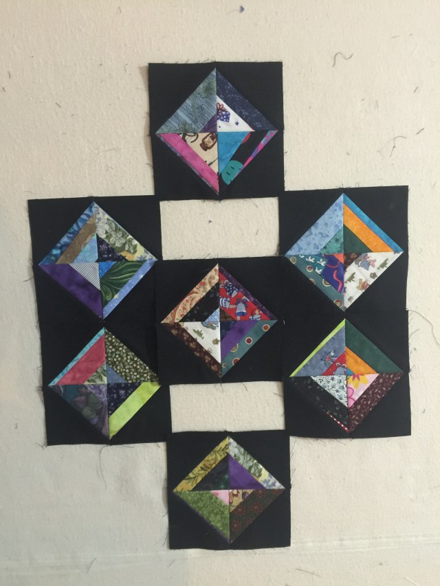 I’m working on a new string quilt design and ended up having some leftover 3 1/2″ squares. I sewed the squares together into blocks and now I need to decide on a layout for them. I’ve laid the blocks out several ways and This is what I’m thinking…….now.