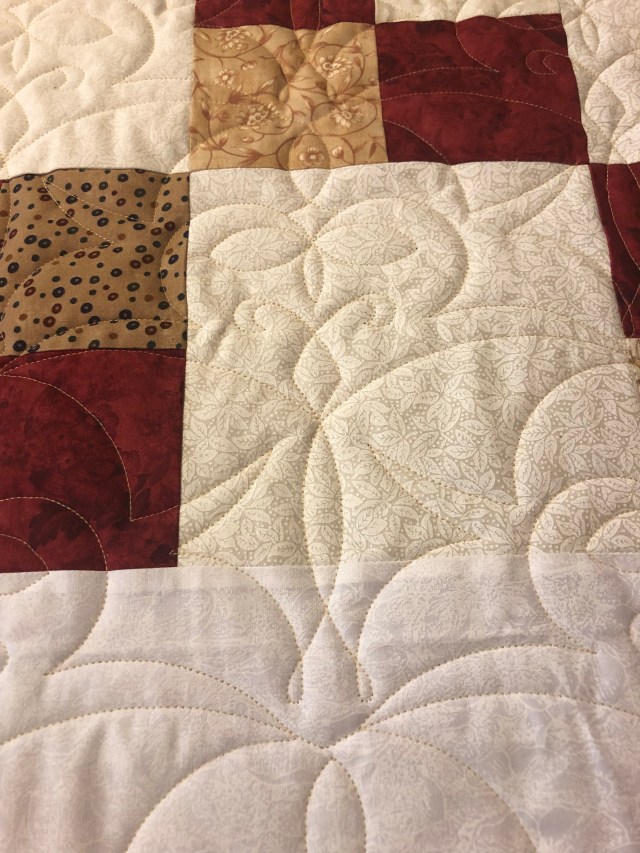 Sometimes it can be difficult trying to decide on background fills. This quilt was one that I did several different fills on each block. Doing each one different was fine when there was a sashing to separate them. But this section didn’t have the blocks separated so I came up with this idea. One block was pebbled, one block was McTavished and the last block was a combination of both. I like the way it turned out and so did my customer.😀