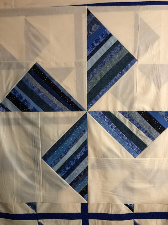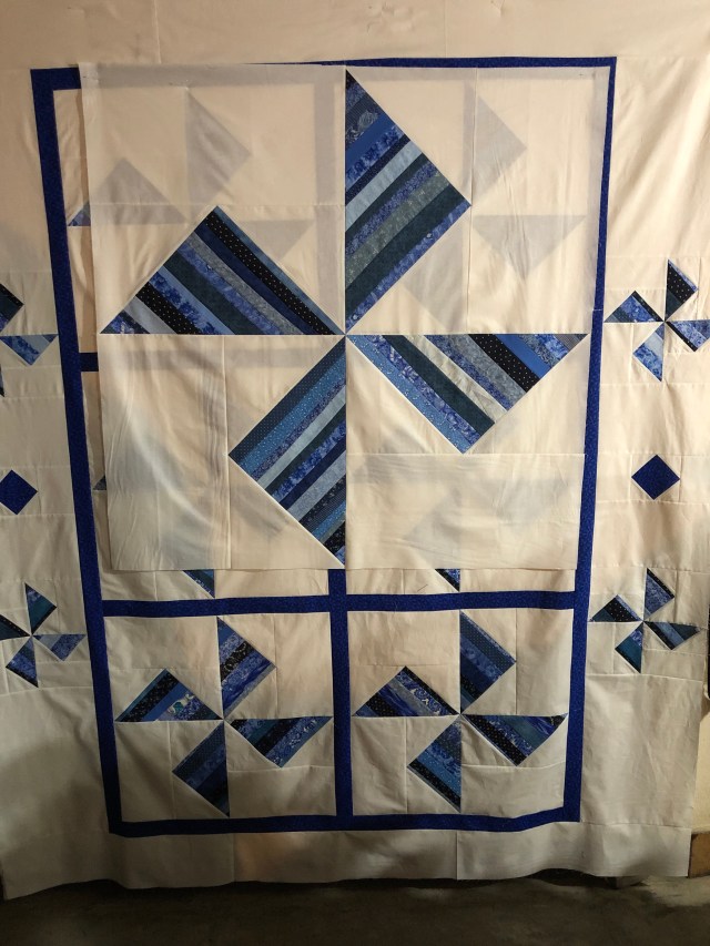 The pinwheel will be the center of the back. I haven’t decided what fabric to use with it to make the back big enough. At this point I’m just glad the giant pinwheel is done.πŸ˜€