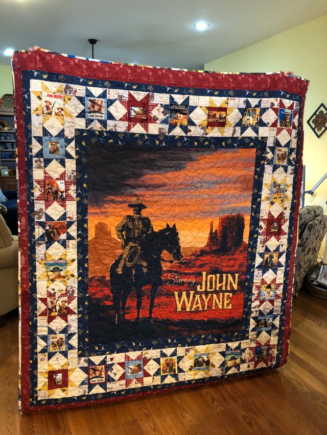 Anyway, Doris secretly made her quilt and told me that she had a lot of fabric left over from the kit and that I could probably get another quilt from it! I then ordered the panel and one yard of fabric. Using the fabric I ordered and Doris’s leftover fabrics, I was able to make my husband a quilt. We both gave our husbands their John Wayne quilts for Christmas and they were blown away!! I even managed to quilt them without my husband seeing them.