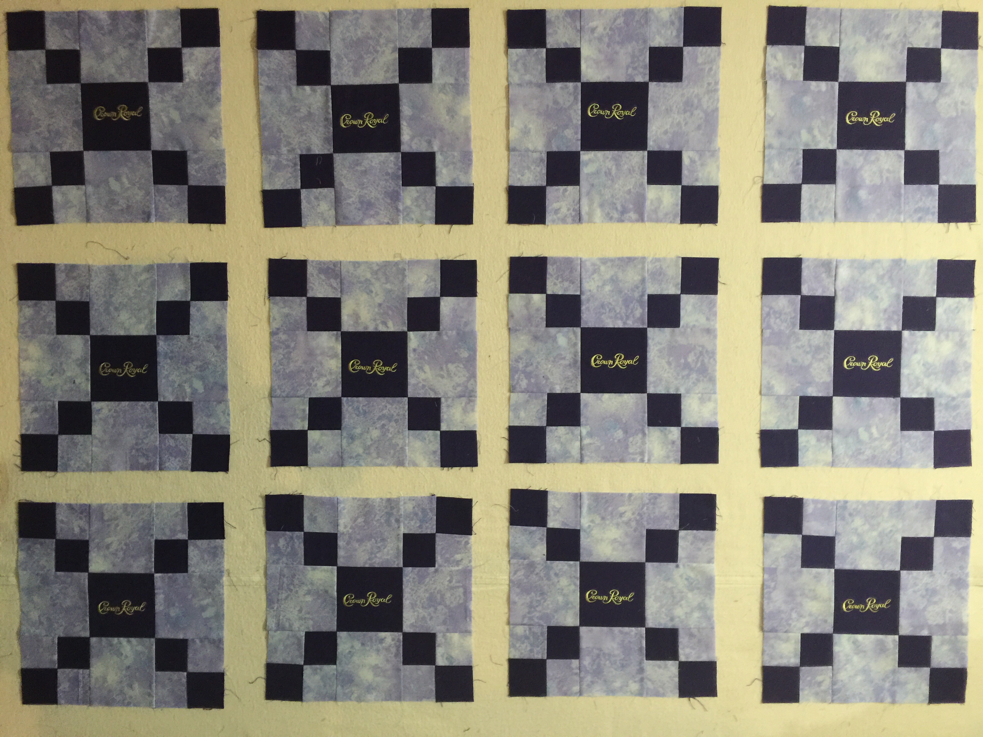 I know some people are against using glue in the construction of thier quilts, but I am “not” one of those people. I love how easy it is to glue the pieces together and then just sit down at the sewing machine and sew. I’ve been working on the crown royal blocks, which has really gone together quick! I like doing things that are quick, that way I can get more things done.