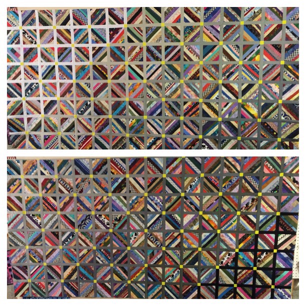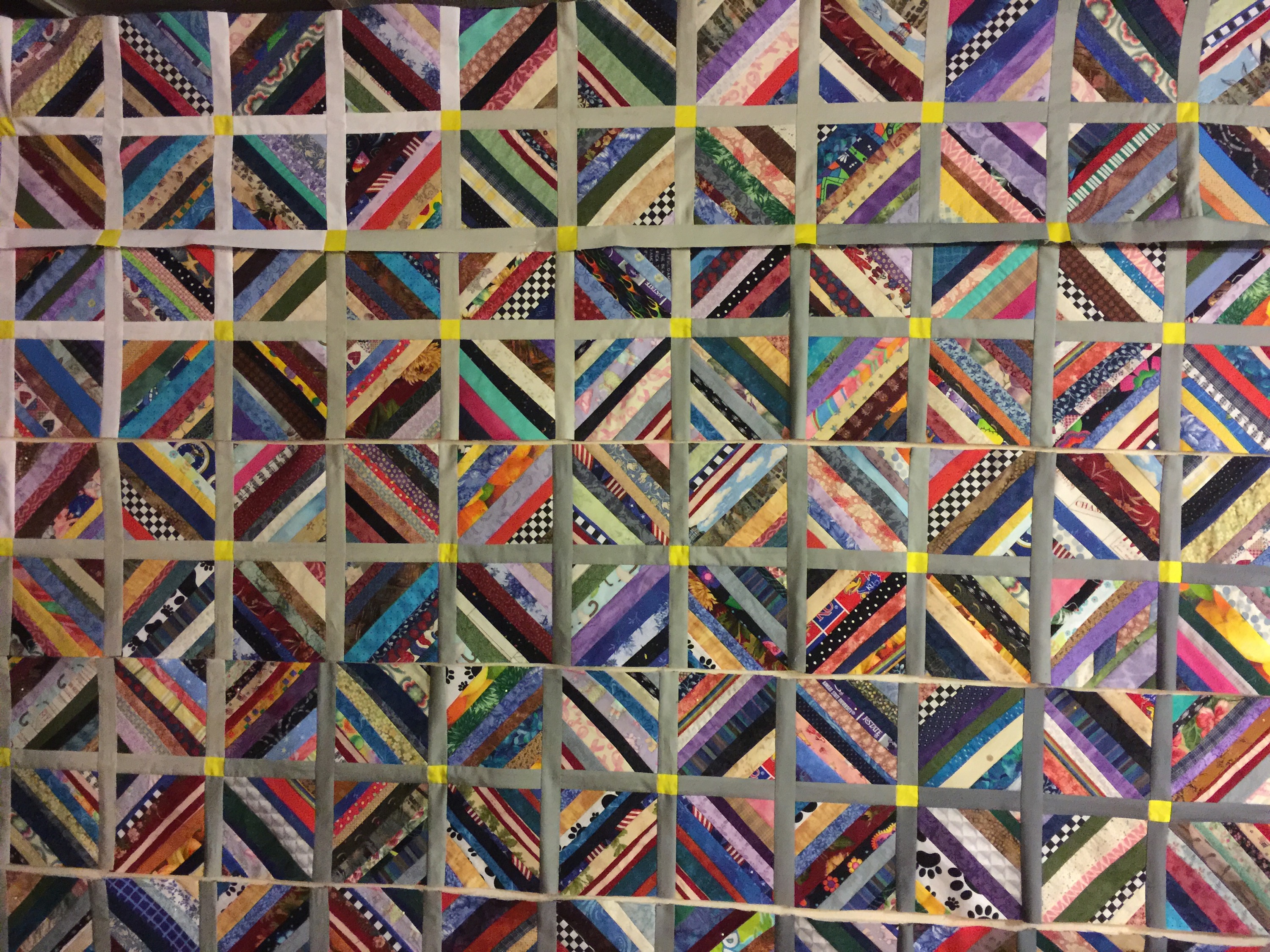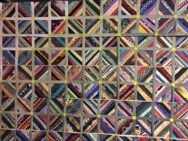 The squares are 8″ finished size, so I needed to come up with 8″ blocks and I wanted something fast! I decided to use a quick strip block and here’s what I have so far. It went together pretty quick, now I need to put a little black sashing in between the blocks. If I can get it done, I’ll give it to my son for a Christmas present. We’ll see how that goes…..