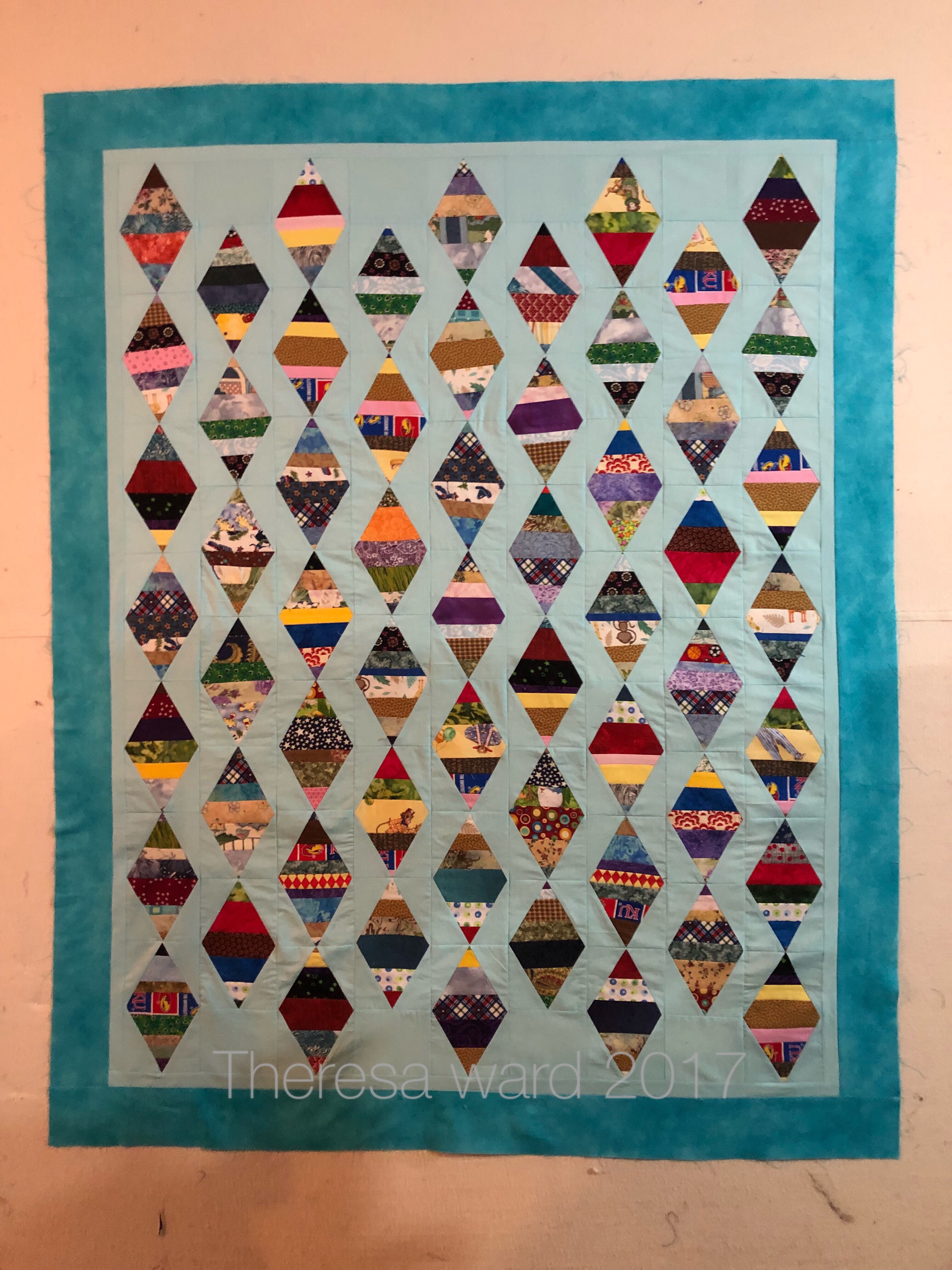 After posting pictures of my pieced borders, I got some positive remarks about them, so I designed another quilt using the diamond shapes. There seems to be no end to the use of strings!!